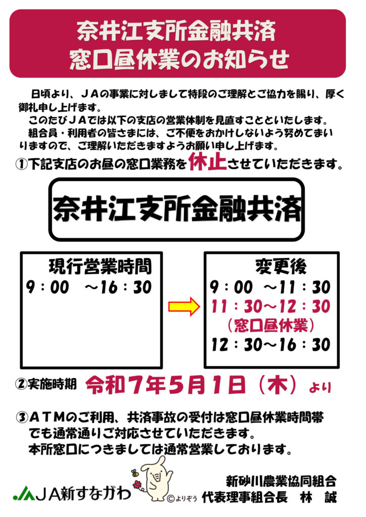 奈井江支所金融共済窓口昼休憩のお知らせ(令和7年5月1日より)